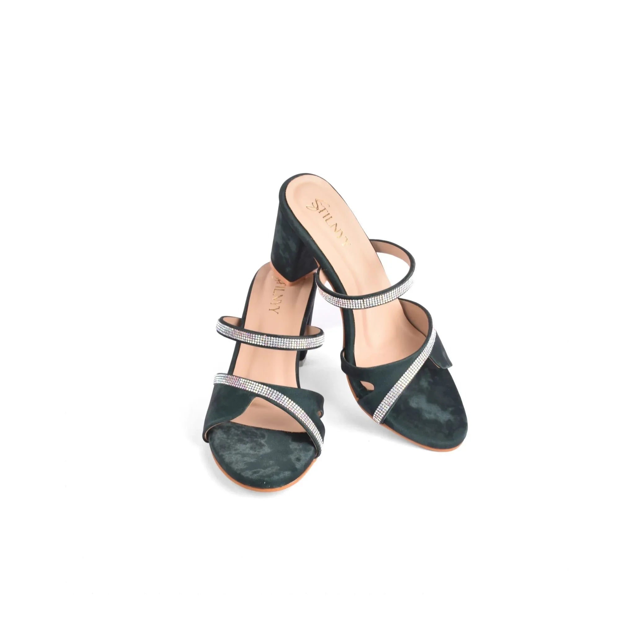 Step into evening glamour with the Midnight Aurora Strap Heels– rich velvet sandals in a deep green tone, finished with twin crystal straps that sparkle with every move. The sleek block heel gives you party-perfect height while keeping the fit stable and comfortable for long nights out.
