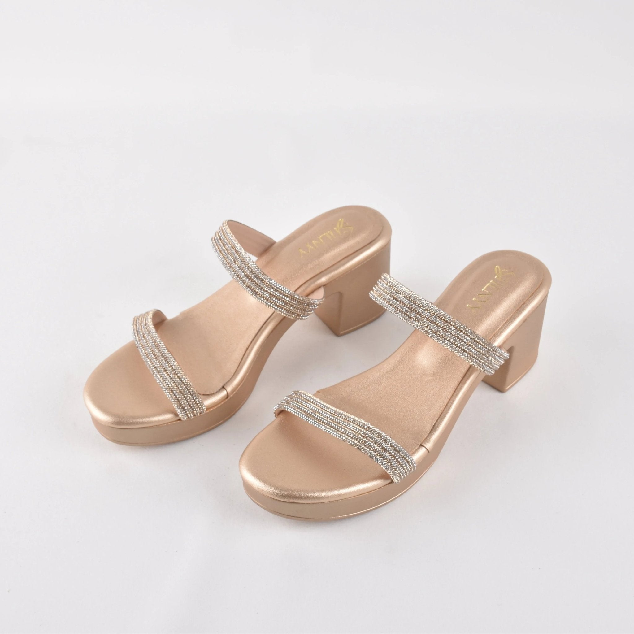 Step into effortless sparkle with the Shine Theory Platform Heels Designed in a soft champagne-gold tone with shimmering crystal straps, this platform slide delivers the perfect balance of comfort and celebration-ready glam.