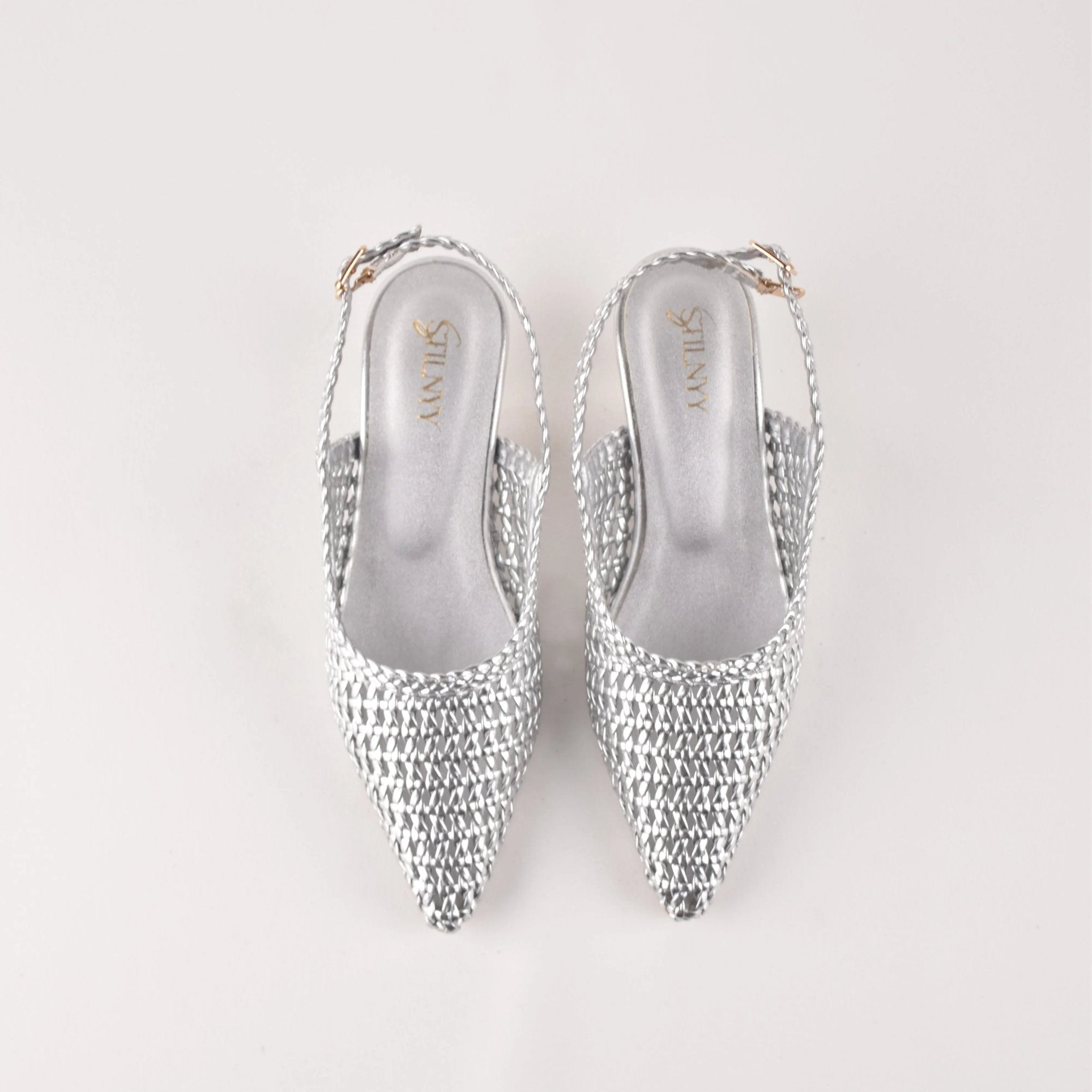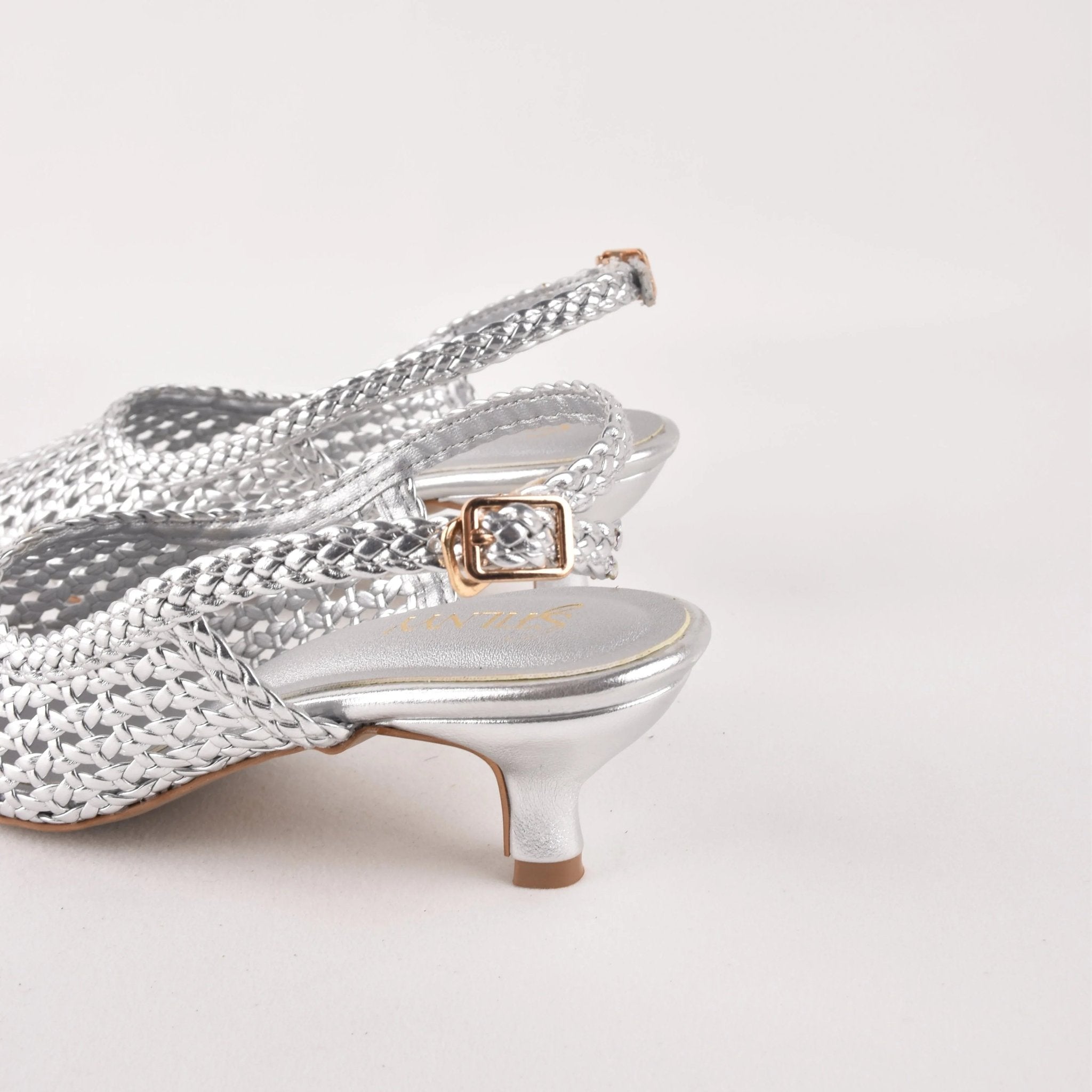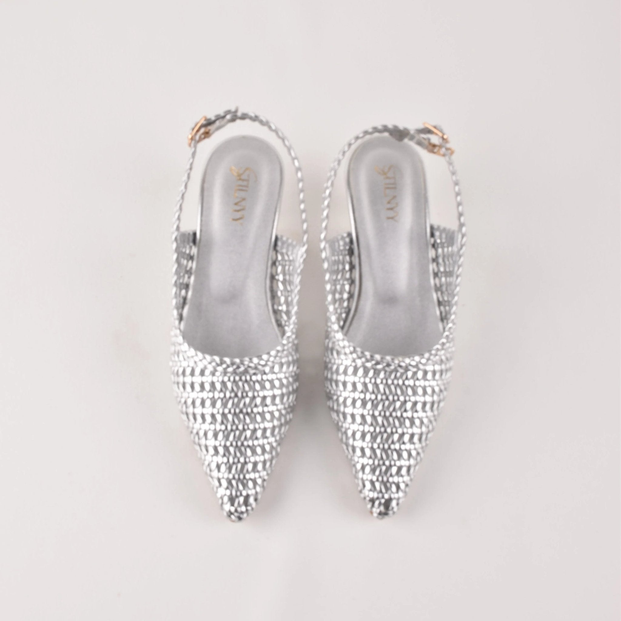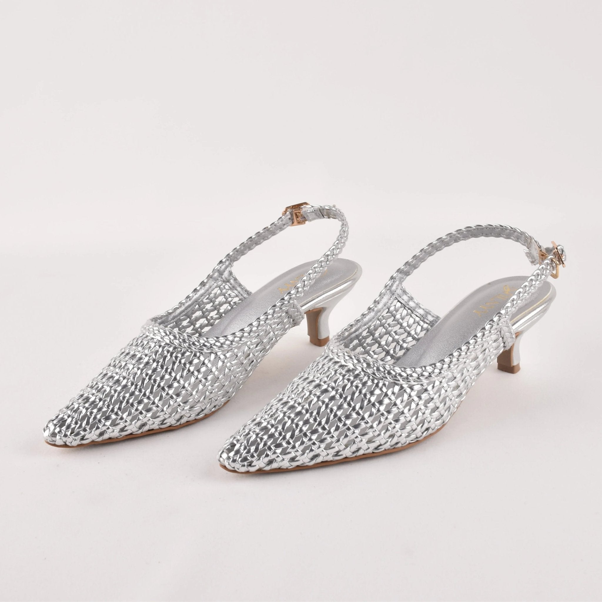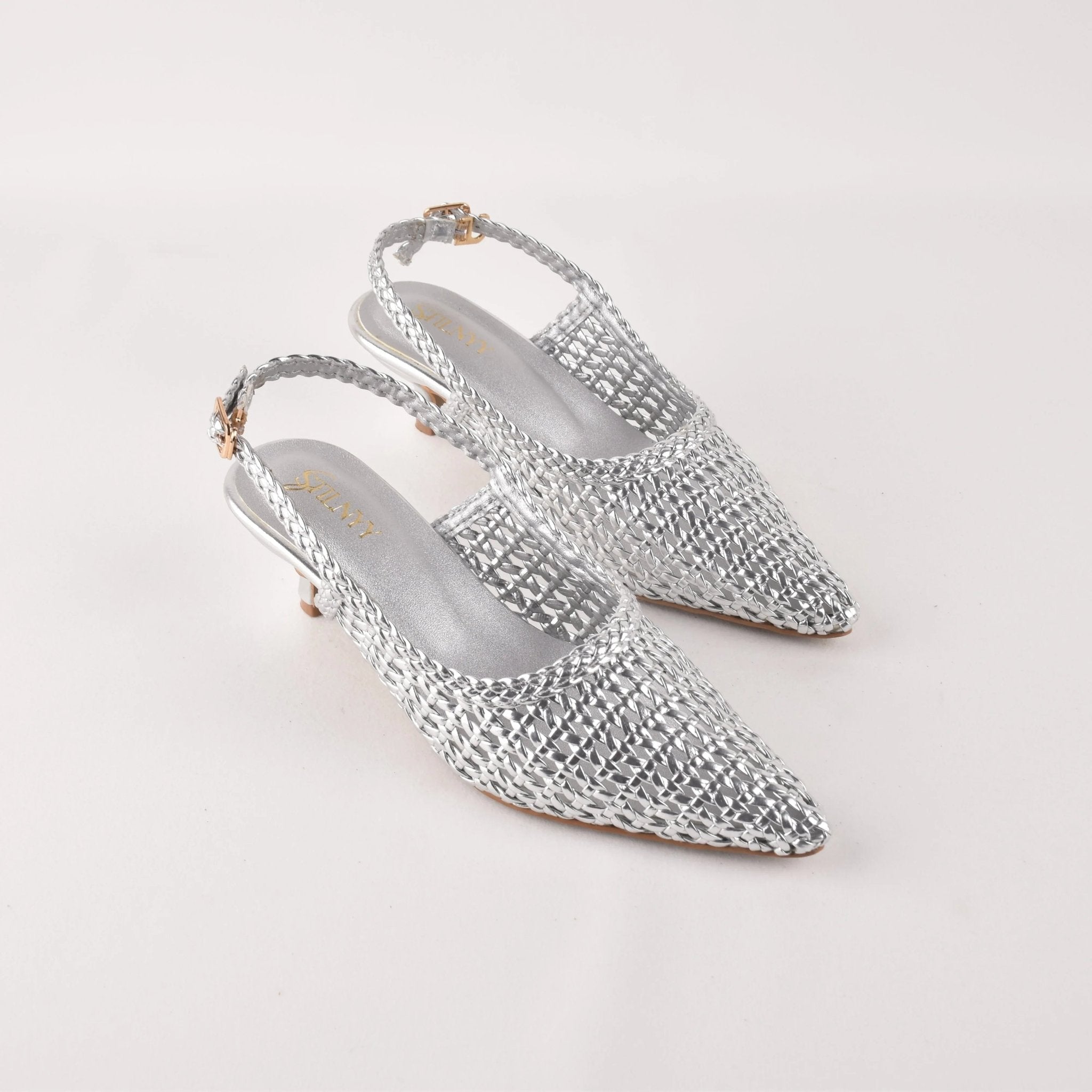 Hi, I'm Silver Hush Sling Heels - silver shimmer designed to catch the light with every step. Intricate texture meets a sharp pointed silhouette for effortless elegance.